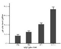 تعیین ارتباط تعداد اولیه سلولهای کشت شده با شدت فعالیت سلول: به منظور بررسی رفتار سلولهای ماتریکس بند ناف در جمعیتهای مختلف، 48 ساعت پس از کشت سلولها، محلول Wst-1 به چاهکهای مربوطه اضافه و میزان فعالیت میتوکندری سلولها اندازهگیری شد. اطلاعات بدست آمده نشان داد كه اين سلولها توانايي تقويت رشد يكديگر را دارند. نمودار 1 بيانگر اين نكته ميباشد كه در جمعيت¬هاي سلولي متفاوت، نسبت رشد سلولها كه بوسيله كيت Wst-1 سنجيده شده است، تغيير ميكند؛ به عبارت دیگر، سرعت تکثیر و رشد سلولها با افزایش تعداد سلول افزایش مییابد.